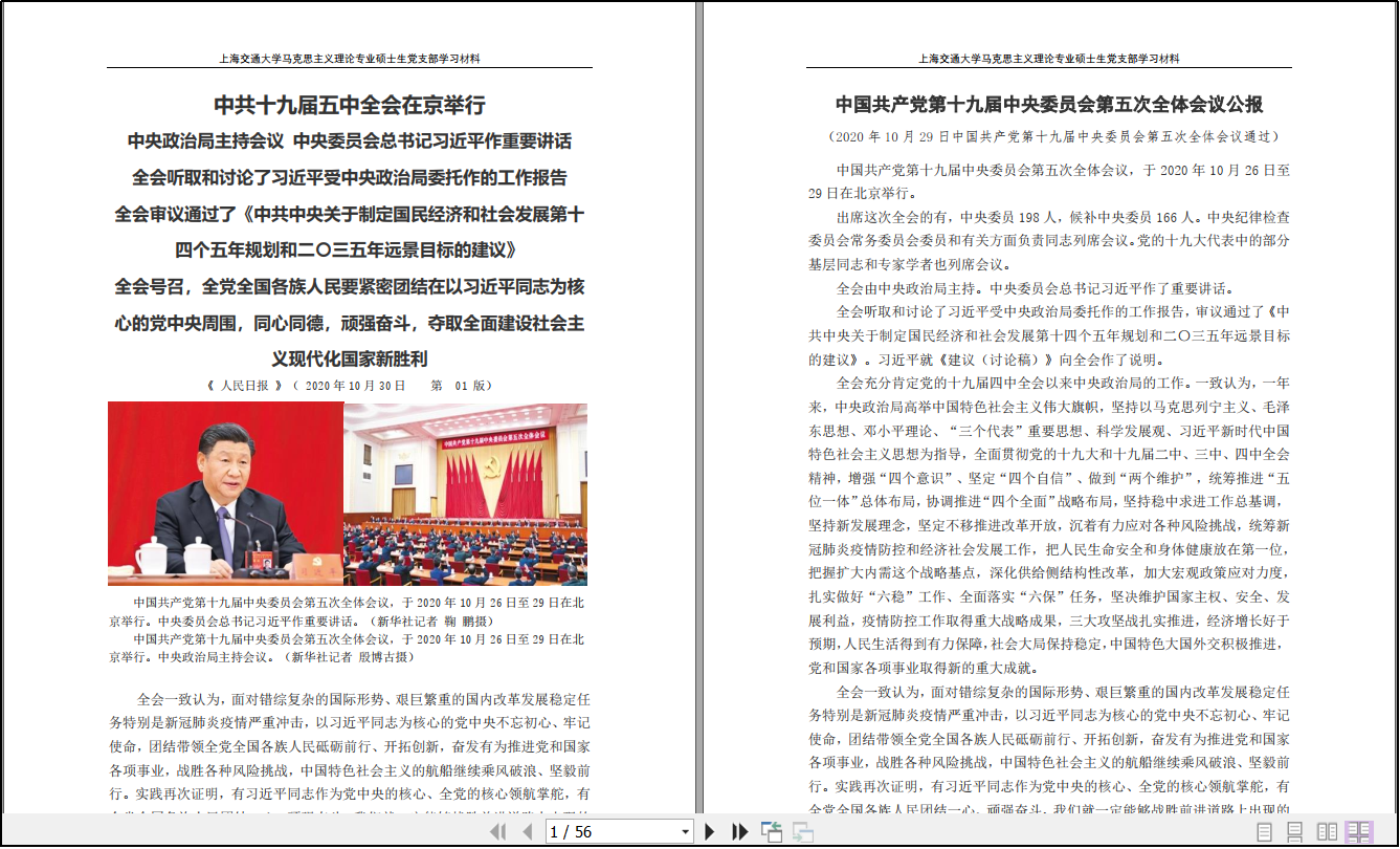 自十九届五中全会召开以来,捆绑调教 马克思主义理论专业硕士生党支部多措并举推进全会精神贯彻落实,专门汇总关于十九届五中全会的学习材料下发给支部党员与积极分子,推进全会精神在支部落地生根。