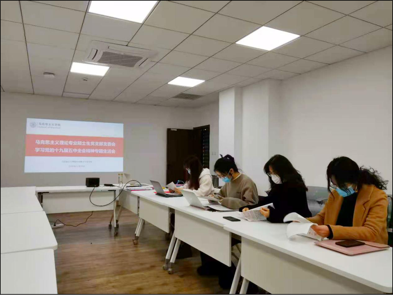 为总结前一阶段支部学习全会精神情况,更好推进支部深入学习贯彻党的十九届五中全会精神,马克思主义理论专业硕士生党支部于2020年11月29日19:00在老法学楼B401会议室专门召开学习党的十九届五中全会精神专题支委会,由支部书记带领支委同志进一步学习全会精神及有关文件和重要讲话,并对支部下一步工作进行部署和安排。