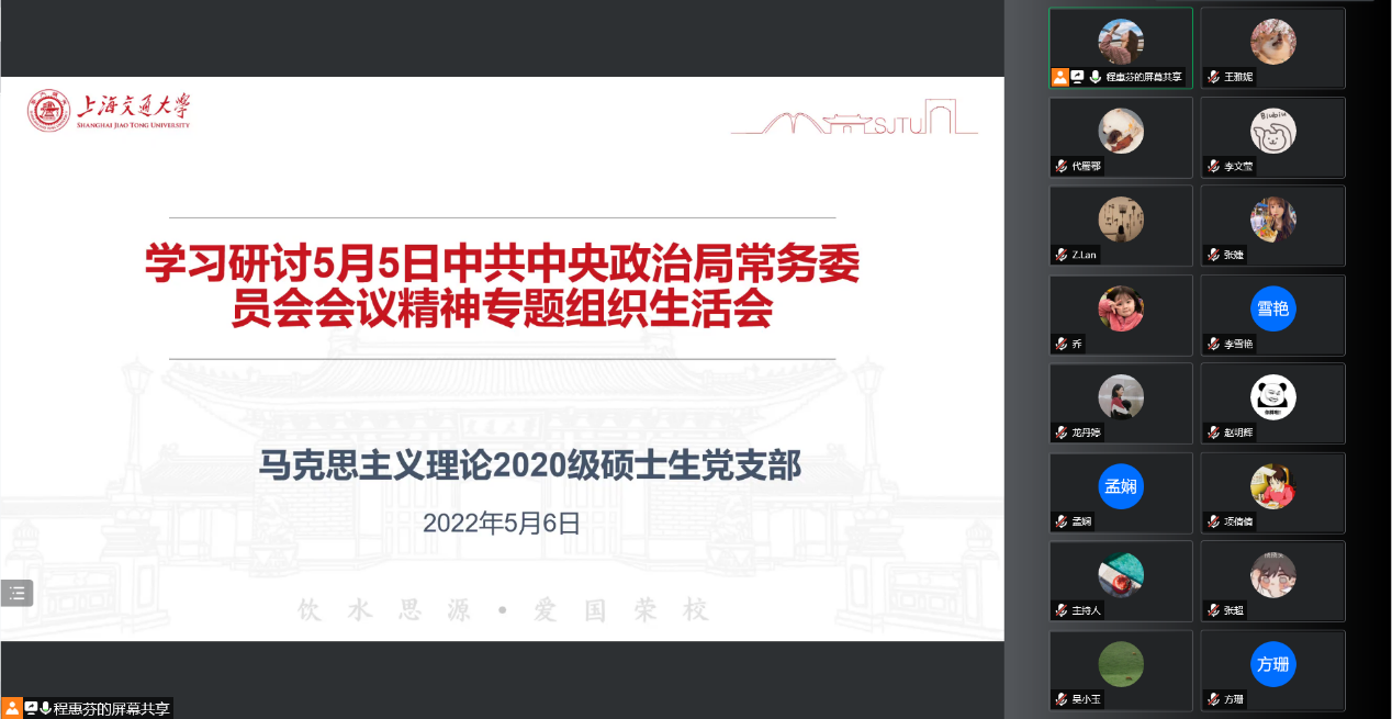 在捆绑调教 党委的部署下,2022年5月6日,马克思主义理论2020级硕士生党支部举行了线上专题组织生活会,深入中央政治局常委会会议精神。本次活动由党支部书记程惠芬同志主持,支部26名党员同志参加会议,12位入党积极分子列席会议。